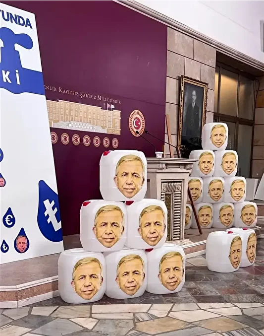 AK Parti Ankara Milletvekili Osman Gökçek, TBMM'de basın toplantısı düzenledi. Gökçek, toplantı salonuna Mansur Yavaş'ın fotoğraflarının olduğu boş bidonlar koydu.