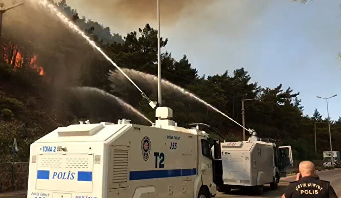 Karayolu kenarındaki yangını söndürmek için emniyet müdürlüğüne bağlı TOMA’lar da yangın söndürme çalışmalarına katılıyor. TOMA araçları alevlere su sıkarak müdahale ediyor.