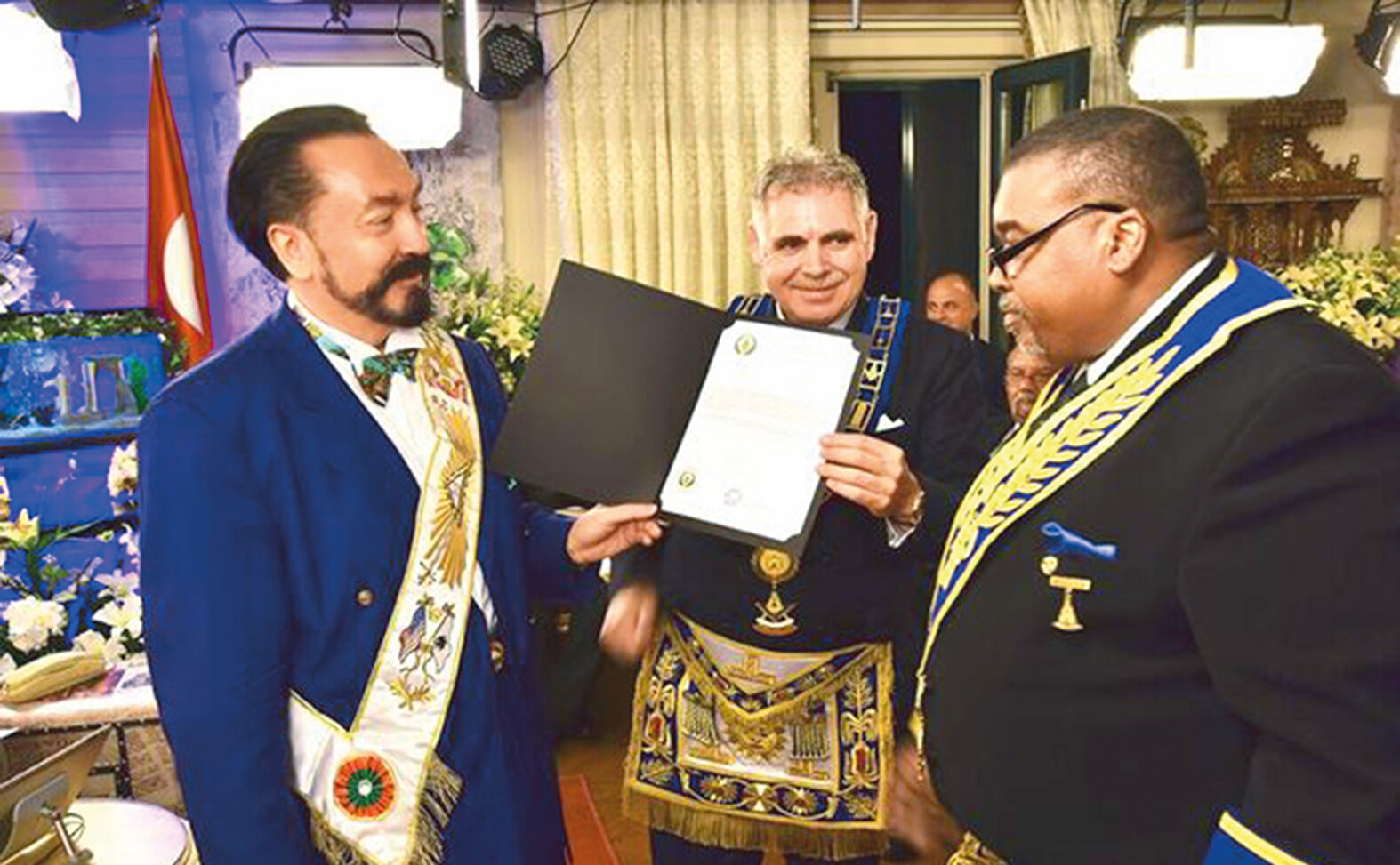 - Mason olduğunu bizzat kendisi açıklayan ve masonlarla ilgili övgü dolu sözler söyleyen çete elebaşısı Oktar, canlı yayında Masonları ağırlamıştı. Kendi kanalı A9’da İtalyan Büyük Locası büyük üstadı Gian Franco Pilloni tarafından 33. derece Mason Diploması takdim edilen örgüt lideri Adnan Oktar da mason liderine “emrinizdeyim” demişti.