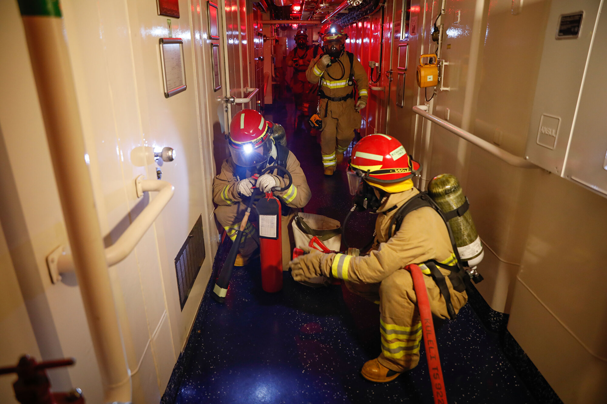 Gemide 21 kişilik astsubay ve erbaşlardan yangın müdahale ekibi de bulunuyor. Sık sık yangın tatbikatı yapan ekibin bu çalışması aksiyon filmlerini aratmıyor. Ekip dumanlar içinde önce yangına ilk müdahaleyi yapıyor. Ardından gerçek bir olay gibi gemideki elektrik kesiliyor ve müdahale acil durum ışığında dumanlar içinde sürdürülüyor. Yangının söndürülmesi ile de tatbikat tamamlanıyor.
