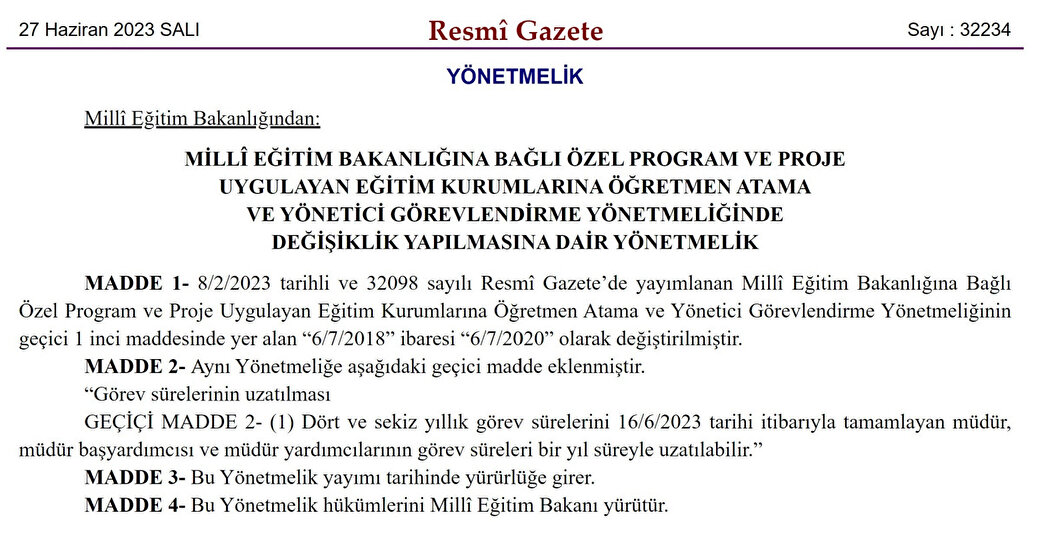 Resmi Gazete'de yayımlanan karara göre; Milli Eğitim Bakanlığına (MEB) bağlı özel program ve proje uygulayan eğitim kurumlarına öğretmen atama ve yönetici görevlendirme yönetmeliğinde değişikliğe gidildi. Yapılan açıklamada, "Dört ve sekiz yıllık görev sürelerini 16/6/2023 tarihi itibarıyla tamamlayan müdür, müdür başyardımcısı ve müdür yardımcılarının görev süreleri bir yıl süreyle uzatılabilir." denildi.
