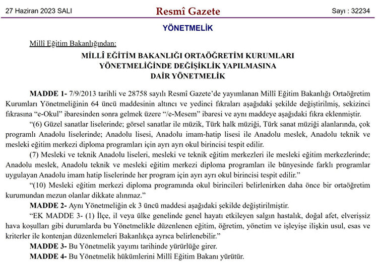 Resmi Gazete'nin 27 Haziran 2023 tarihli sayısı yayımlandı. yayımlanan karara göre; Milli Eğitim Bakanlığına (MEB) bağlı özel program ve proje uygulayan eğitim kurumlarına öğretmen atama ve yönetici görevlendirme yönetmeliğinde değişikliğe gidildi. Yapılan açıklamada,
