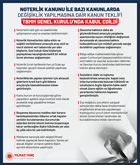 TBMM Genel Kurulu’nda kabul edilerek yasalaşan 'Noterlik Kanunu ile Bazı Kanunlarda Değişiklik Yapılmasına Dair Kanun Teklifi'nin ülkemize ve milletimize hayırlı olmasını diliyorum.
