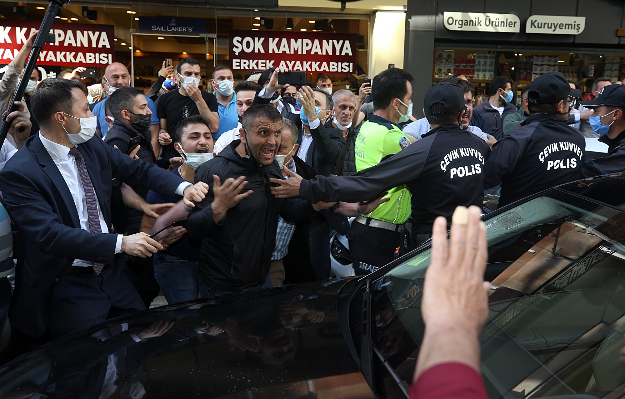 Ziyaretine devam etmek isteyen Akşener'e kalabalık bir grup protestolarını sürdürdü. Bazı kişilerin araçlara su şişesi, domates ve ayakkabı attıkları gözlendi.
