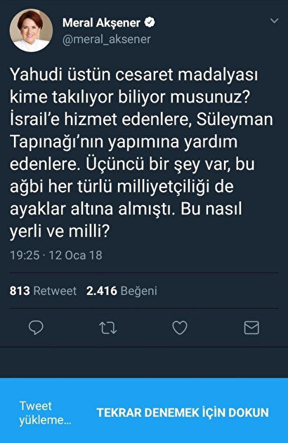 İYİ Parti Genel Başkanı Meral Akşener, çirkin bir üslupla Netanyahu’ya benzettiği Cumhurbaşkanı Erdoğan’ın kendisine cevap vermesi sonrası yalana sarıldı. 2’inci Dünya Savaşı’nda Yahudilerin hayatını kurtaran Türk diplomatları anısına, Türk milletini temsilen dönemin Başbakan'ı Erdoğan'a verilen ‘Yahudi cesaret madalyası’nı, Cumhurbaşkanı Erdoğan’ın şahsına verilmiş gibi çarpıttı. Akşener, daha önce de aynı yalanı paylaşıp daha sonra silmişti.