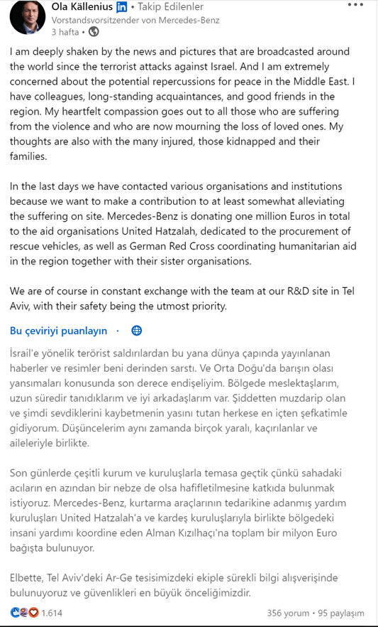 Yaptıkları yardımın miktarını LinkedIn paylaşımıyla duyuran Kaellenius, şu ifadeleri kullandı: