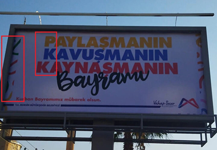 Mersin’de Kurban Bayramı kutlaması için belediye tarafından asılan afişler görenleri şoke etti. Haber7'de yer alan habere göre terör örgütünü temsil eden renklerin kullanıldığı ve PKK’ya gönderme yapan kelimeler seçildiği afişte, kelimelerin baş harflerinin terör örgütünün ismini ortaya çıkardığı fark edildi.