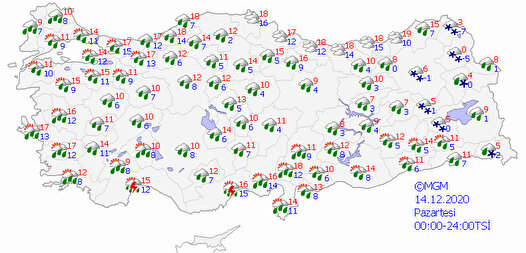 Meteoroloji Genel Müdürlüğü 14 Aralık hava durumu raporunu paylaştı. Meteoroloji'den yapılan son değerlendirmelere göre, ülke genelinin parçalı ve çok bulutlu, Sinop ile Orta ve Doğu Karadeniz kıyıları dışında kalan diğer bölgelerin yağışlı geçeceği tahmin ediliyor. Yağışların; genellikle yağmur ve sağanak, Akdeniz kıyılarında gök gürültülü sağanak, Erzurum, Erzincan, Tunceli, Bingöl, Muş, Bitlis ve Hakkâri çevrelerinin yüksekleri ve Akdeniz’in Toroslar mevkisinin yükseklerinde karla karışık yağmur ve yer yer kar şeklinde olması bekleniyor. İşte il il hava durumu..