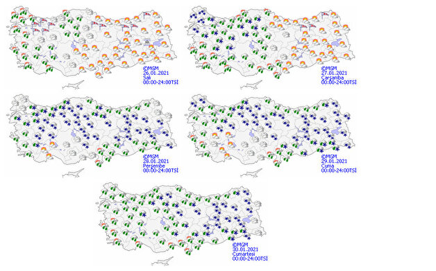 Meteoroloji yetkilileri tarafından yayınlanan hava durumu raporuna göre, sıcaklık bu geceden itibaren Trakya Bölgesi'nden girecek soğuk hava dalgasıyla birlikte hissedilir derecede azalacak. Gece saatlerinde Trakya ile Çanakkale çevrelerinde yoğun kar yağışı bekleniyor. İç Anadolu'nun doğusu ile Doğu Anadolu'da kuvvetli buzlanma ve don olayı bekleniyor İstanbul'da bugün öğleden sonra sağanak yağış görülecek. Yarın ve perşembe günü ise karla karışık yağmur ve kar yağışının görüleceği tahmin ediliyor. Bir uyarı da AKOM'dan geldi. Yetkililer, megakentte hava sıcaklarının 8 ila 12 derece düşmesinin beklendiğini, il genelinde karla karışık yağmur, şehir merkezi dışında kalan kesimlerde ise hafif kar yağışlarının etkili olacağını bildirdi.
