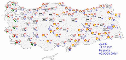 Meteoroloji Genel Müdürlüğünden yapılan son değerlendirmelere göre, Türkiye'nin iç ve batı kesimlerinde hava bugün parçalı ve yer yer çok bulutlu olacak. Akşam ve gece saatlerinde Marmara, Ege ve Batı Akdeniz ile Eskişehir çevrelerinin yağışlı, diğer yerlerde havanın az bulutlu geçmesi öngörülüyor.