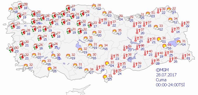 Yapılan son değerlendirmelere göre; Ülkemizin kuzey, iç ve batı kesimlerinin parçalı yer yer çok bulutlu, Marmara'nın güney ve doğusu, Kuzey ve İç Ege, İç Anadolu'nun kuzeybatısı, Batı ve Doğu Karadeniz ile Kırklareli, Tekirdağ, Aydın ve Çorum çevrelerinin yerel olmak üzere sağanak ve gök gürültülü sağanak yağışlı, diğer yerlerin az bulutlu geçeceği tahmin ediliyor. Yağışların, öğle saatlerine kadar Balıkesir, Bursa, Kocaeli, Sakarya ve Yalova çevrelerinde yerel olmak üzere kuvvetli (metrekareye 21-50 kg) olması bekleniyor.