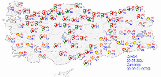 Parçalı ve çok bulutlu, akşam saatlerine kadar yerel olmak üzere sağanak ve gök gürültülü sağanak yağışlı geçecek. Yağışların öğle saatlerinden sonra kuvvetli olması tahmin ediliyor.
