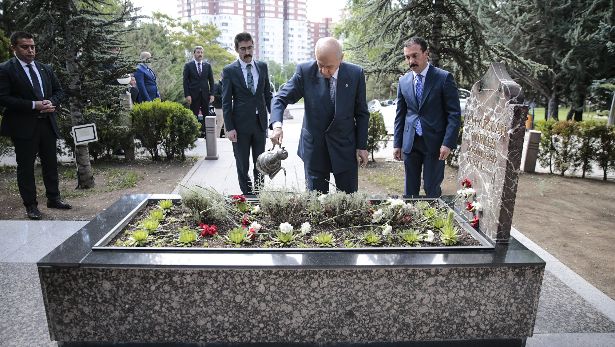 MHP Genel Başkanı Devlet Bahçeli, MHP'nin Kurucu Genel Başkanı Alparslan Türkeş'in Beştepe'deki anıt mezarını ziyaret etti. Okunan Kur'an-ı Kerim'in ardından dua eden Bahçeli, Türkeş'in kabrine kırmızı ve beyaz karanfiller bıraktı ve bakır ibrikle mezara su döktü.