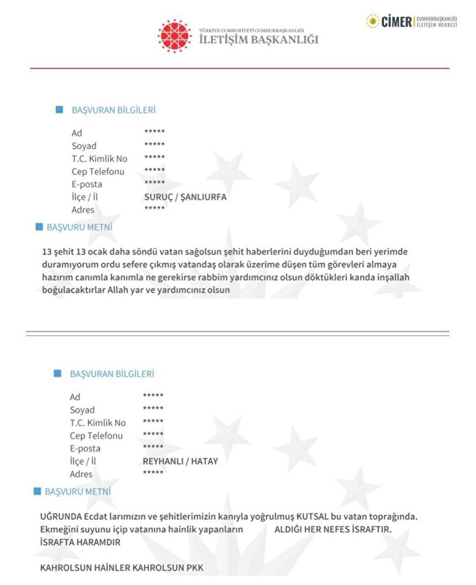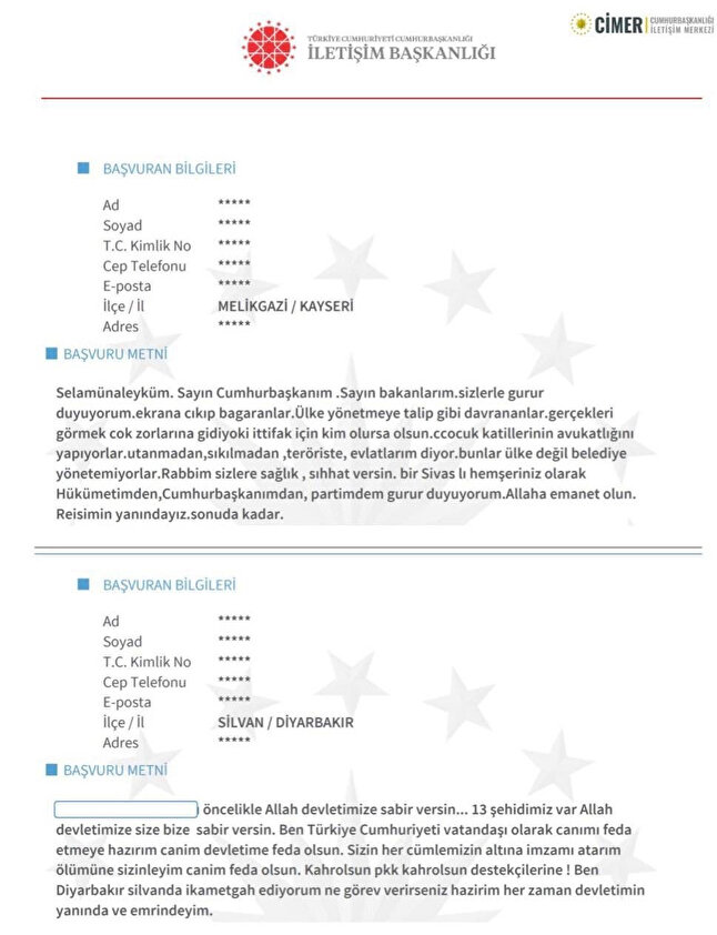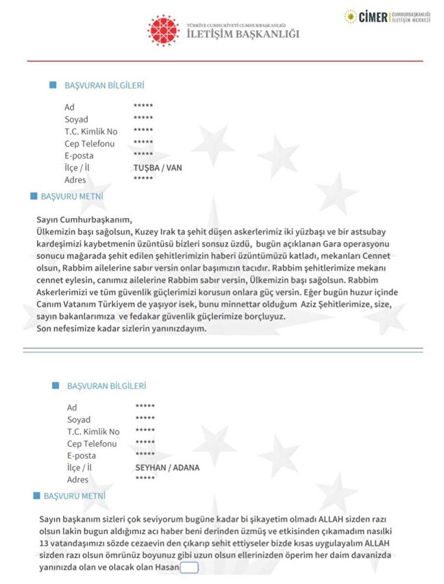 Gara'da 13 vatandaşımızın şehit edilmesinin ardından Türkiye teröre karşı adeta tek yürek oldu. İletişim Başkanı Fahrettin Altun, vatandaşların Cumhurbaşkanlığı İletişim Merkezi'ne (CİMER) gönderdiği Türk Silahlı Kuvvetleri'nin (TSK) Gara'ya yaptığı operasyon ile ilgili destek mesajlarını paylaştı.