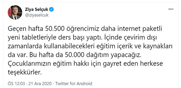 Milli Eğitim Bakanı Ziya Selçuk, Twitter hesabından yaptığı açıklamada, "Geçen hafta 50 bin 500 öğrencimiz daha internet paketli yeni tabletleriyle ders başı yaptı. İçinde çevirim dışı zamanlarda kullanabilecekleri eğitim içerik ve kaynakları da var. Bu hafta da 50 bin dağıtım yapacağız. Çocuklarımızın eğitim hakkı için gayret eden herkese teşekkürler" ifadelerini kullandı.