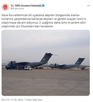 Milli Savunma Bakanlığı, Twitter hesabından yaptığı paylaşımda "Hava Kuvvetlerimize ait uçaklarla deprem bölgesinde arama-kurtarma çalışmalarına katılacak ekipleri ve gerekli araçları İzmir’e ulaştırmaya devam ediyoruz. 2 uçağımız daha İzmir’e yardım elini ulaştırmak için Diyarbakır’dan havalandı" ifadelerini kullandı.
