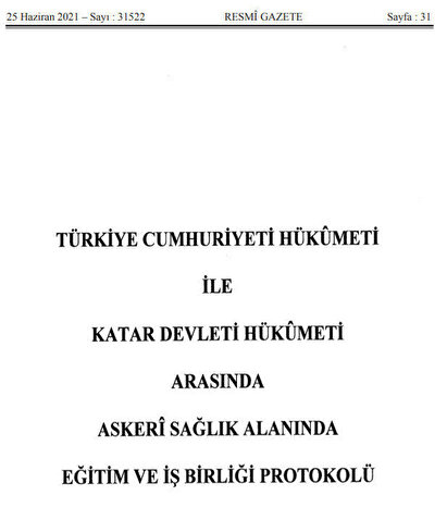 Türkiye ile Katar arasında 2 Mart 2021 tarihinde "Askeri sağlık alanında eğitim ve iş birliği" protokolü adlı bir anlaşma imzalandı. Bu anlaşma uyarınca, Türkiye'nin en büyük askeri üslerinden birine ev sahipliği yapan Katar ile askeri iş birliğinin kapsamı daha da genişledi.