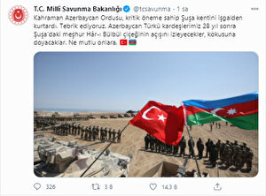 Milli Savunma Bakanlığı, işgalden kurtarılan Şuşa kenti için bir paylaşım yaptı. Paylaşımda, “Kahraman Azerbaycan Ordusu, kritik öneme sahip Şuşa kentini işgalden kurtardı. Tebrik ediyoruz” denildi.