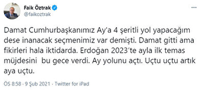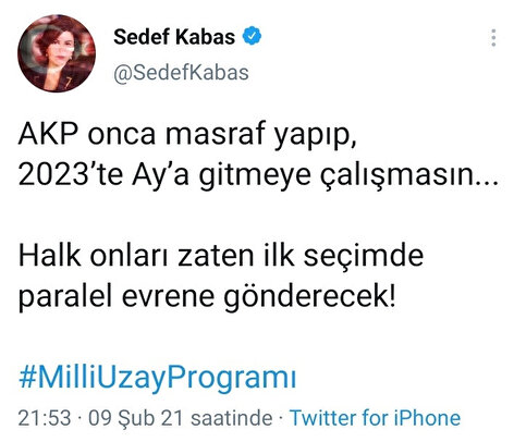 Duyurunun ardından Sözcü yazarı Yılmaz Özdil, CHP sözcüsü Faik Öztrak, Tele1 sunucusu Sedef Kabaş ve İYİ Parti Genel Başkan Yardımcısı Bahadır Erdem, Milli Uzay Programı ile dalga geçmeyi tercih etti. İşte o paylaşımlar: