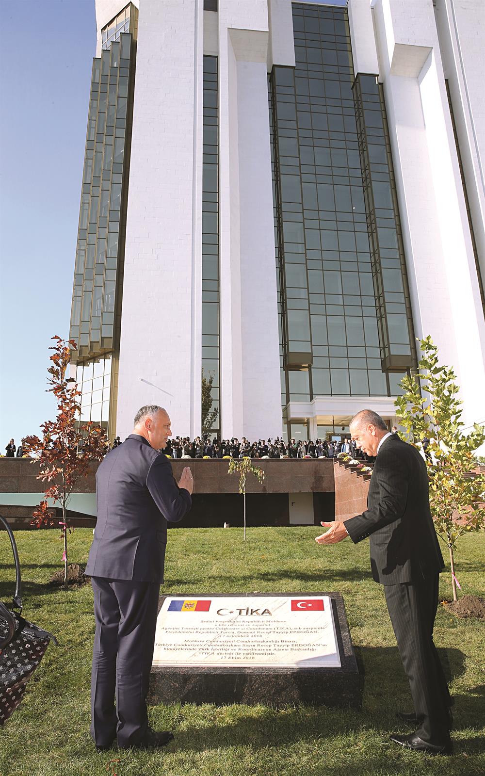 Moldova Cumhurbaşkanı Dodon, konuşmaların ardından Türkiye ile Moldova arasındaki dostluk ilişkileri ile çeşitli alanlarda işbirliğinin geliştirilmesi ve aynı zamanda Moldova'ya verdiği destekten dolayı Erdoğan'a Cumhuriyet Nişanı tevcih etti. Erdoğan ve Dodon daha sonra TİKA tarafından restorasyonu yapılan Cumhurbaşkanlığı bahçesinde bulunan ve üzerinde "Moldova Cumhuriyeti Cumhurbaşkanlığı binası Türkiye Cumhuriyeti Cumhurbaşkanı Sayın Recep Tayyip Erdoğan'ın himayelerinde Türk İşbirliği ve Koordinasyon Ajansı Başkanlığı (TİKA) desteği ile yenilenmiştir" ifadesinin bulunduğu anıt taşının açılışını yaptı. İki cumhurbaşkanı daha sonra Cumhurbaşkanlığı bahçesine kendileri adına dikilen çınar ve kırmızı meşe ağaçlarına toprak atarak, can suyu verdi.