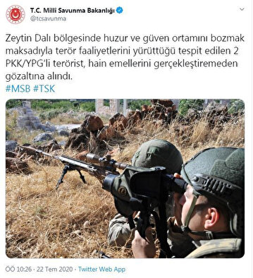 MSB: Zeytin Dalı bölgesinde huzur ve güven ortamını bozmak maksadıyla terör faaliyetlerini yürüttüğü tespit edilen 2 PKK/YPG’li terörist, hain emellerini gerçekleştiremeden gözaltına alındı.