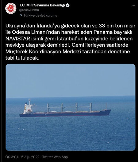 - Bakanlığın Twitter hesabından yapılan açıklamada, "Ukrayna’dan İrlanda’ya gidecek olan ve 33 bin ton mısır ile Odessa Limanı'ndan hareket eden Panama bayraklı 'NAVISTAR' isimli gemi İstanbul’un kuzeyinde belirlenen mevkiye ulaşarak demirledi. Gemi ilerleyen saatlerde Müşterek Koordinasyon Merkezi tarafından denetime tabi tutulacak" denildi.