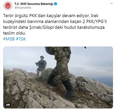 Bakanlığın Twitter hesabından yapılan açıklamada, "Terör örgütü PKK'dan kaçışlar devam ediyor. Irak kuzeyindeki barınma alanlarından kaçan 2 PKK/YPG'li terörist daha Şırnak Silopi'deki hudut karakolumuza teslim oldu" denildi.