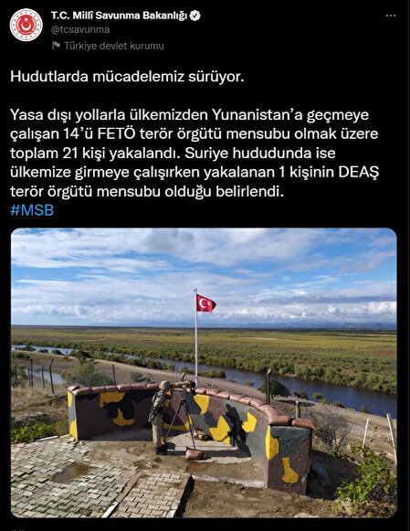 MSB; Yasa dışı yollarla ülkemizden Yunanistan’a geçmeye çalışan 14’ü FETÖ terör örgütü mensubu olmak üzere toplam 21 kişinin yakalandığını duyurdu.