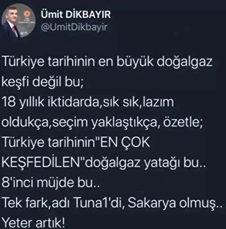 : Türkiye tarihinin en büyük doğalgaz keşfi değil bu; 18 yıllık iktidarda, sık sık, lazım oldukça, seçim yaklaştıkça, özetle; Türkiye tarihinin en çok keşfedilen doğalgaz yatağı bu.. 8. Müjde bu.. Tek fark, adı Tuna1’di, Sakarya olmuş.. Yeter artık!