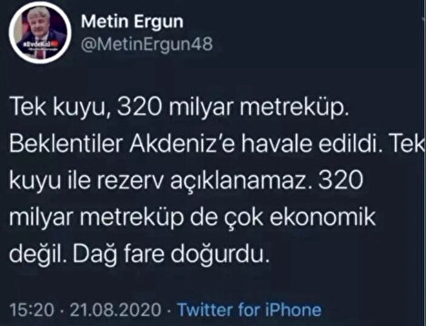 İYİ Partili Metin Ergun: Tek kuyu, 320 milyar metreküp. Beklentiler Akdeniz’e havale edildi. Tek kuyu ile rezerv açıklanamaz. 320 milyar metreküp de çok ekonomik değil. Dağ fare doğurdu.