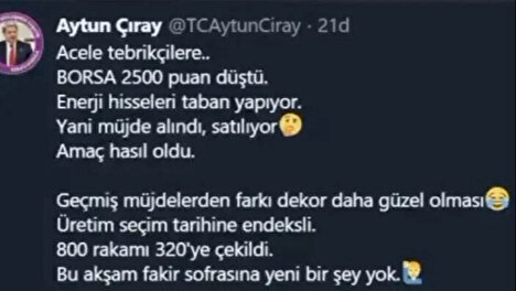 : Acele tebrikçilere.. Borsa 2500 puan düştü. Enerji hisseleri taban yapıyor. Yani müjde alındı, satılıyor. Amaç hasıl oldu. Geçmiş müjdelerden farkı, dekor daha güzel olması. Üretim seçim tarihine endeksli. 800 rakamı 320’ye çekildi. Bu akşam fakir sofrasına yeni bir şey yok.