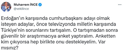 "Erdoğan’ın karşısında cumhurbaşkanı adayı olmak isteyen adaylar, önce televizyonda milletin karşısında Türkiye’nin sorunlarını tartışalım. O tartışmadan sonra güvenilir bir araştırmacıya anket yaptıralım. Anketten kim çıkıyorsa hep birlikte onu destekleyelim. Var mısınız?"