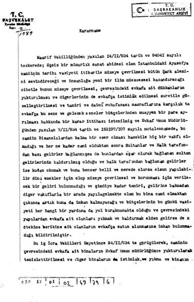 Ayasofya’nın statüsü yeniden tartışma konusu olurken, Danıştay, camiyi müzeye dönüştüren 24 Kasım 1934 tarihli Bakanlar Kurulu ile ilgili kararını 2 Temmuz’da verecek. 1934 tarihli karar, baştan sona şaibelerle dolu. Ayasofya ile ilgili hazırlanan kararnamenin sayısı 1589. Ancak 2 gün önce yani 22 Kasım’da hazırlanan kararnamenin sayısı ise 1606. Hukukçular sayının teknik olarak 1606’nın üstünde olması gerektiğine dikkat çekiyor. İkinci şüphe, kararnamenin Resmî Gazete’de yayımlanmaması. Karardaki Atatürk imzasının da sahte olduğu belirtiliyor. Çünkü Mustafa Kemal, “Atatürk” unvanını resmi olarak 27 Kasım 1934’te aldı.