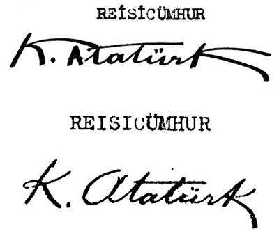 İkinci şaibe ise Atatürk’ün imza biçimi. Atatürk’ün kararnamede imzasının sahte olduğu ifade ediliyor. Atatürk’ün bu imzayı daha önce hiçbir yerde atmadığı ifade ediliyor. Kararnamede Atatürk imzasında ‘a’ harfini büyük ve köşeli yaptığı, oysa ki Atatürk’ün ‘a’ harfini hep küçük ve yuvarlak yazdığı belirtiliyor. ‘K’ harflerinin şekillendiriliş biçimleri ile ‘t’ harfleri kuşaklarının konumu itibariyle de farklılıklar bulunduğu belirtiliyor. Kararnamenin ıslak imzalı orijinali de hala bulunamadı.