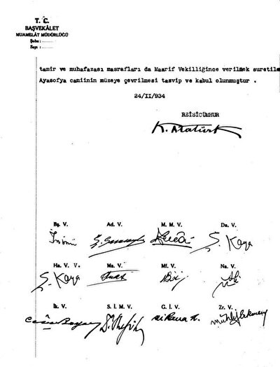 Kararla ilgili en büyük tartışma ise Atatürk’ün imzası konusu. Burada da iki ayrı soru işareti var. Birincisi imzada kullanılan ‘Atatürk’ unvanı. Gazi Mustafa Kemal, ‘Atatürk’ unvanını resmi olarak 27 Kasım 1934 tarihinde alıyor. Karar Resmî Gazete’de 27 Kasım günü ‘Bu kanun neşri tarihinden itibaren muteberdir’ yani ‘yayın tarihinden itibaren geçerlidir’ maddesiyle birlikte yayımlanıyor. Ayasofya’yı müzeye çeviren Bakanlar Kurulu kararı ise 24 Kasım tarihinde imzalanıyor. Yani Gazi Mustafa Kemal’in, ‘Atatürk’ unvanını kullanması hukuken mümkün değil.
