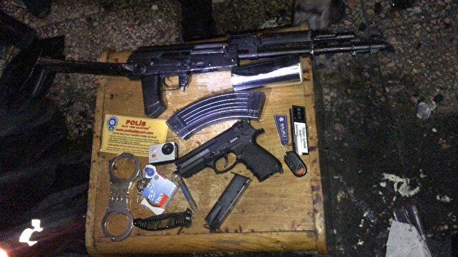 - Tamirhaneye baskın düzenleyen polis, içerideki şüpheli 5 şahsı yere yatırarak etkisiz hale getirdi. Nefes kesen operasyonda şüphelilerin ters kelepçelenerek etkisiz hale getirilmesinin ardından üst aramaları yapıldı.Tamirhanenin çeşitli bölümlerinde devam eden aramalarda çekyatın altından Kalaşnikof diye tabir edilen uzun namlulu silah ve mermileri 2 adet tabanca, kelepçe ve peçete içinde de mermileri ele geçirildi. Ayrıca çok sayıda sahte polis kimliği de bulundu.