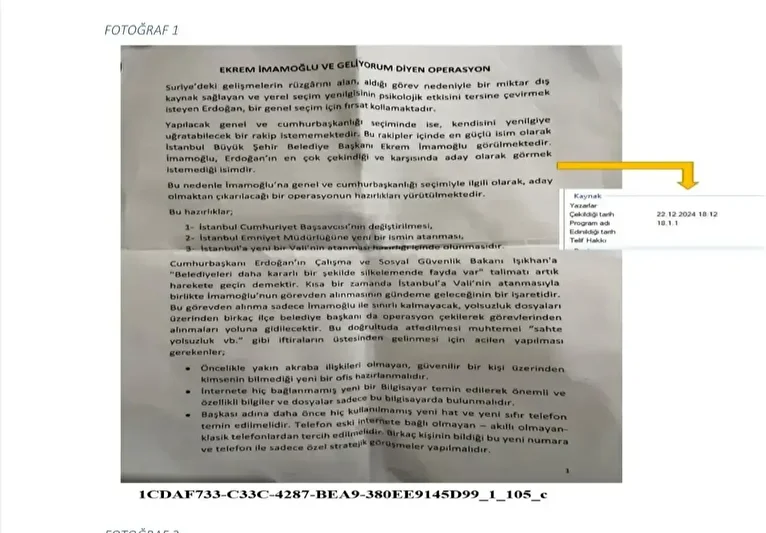 Ekrem İmamoğlu’nun danışmanı Necati Özkan’ın telefonundan çıkan belge, soruşturmanın seyrini değiştirdi. “Ekrem İmamoğlu ve Geliyorum Diyen Operasyon” başlıklı dosyada, gizlilik için alınması gereken dijital ve fiziki önlemler sıralandı. Metinde “yeni hat alın, tuşlu telefon kullanın” gibi talimatlar yer aldı. Belgede ayrıca bazı üst düzey kamu görevlilerine ilişkin dikkat çekici iddialar bulundu.