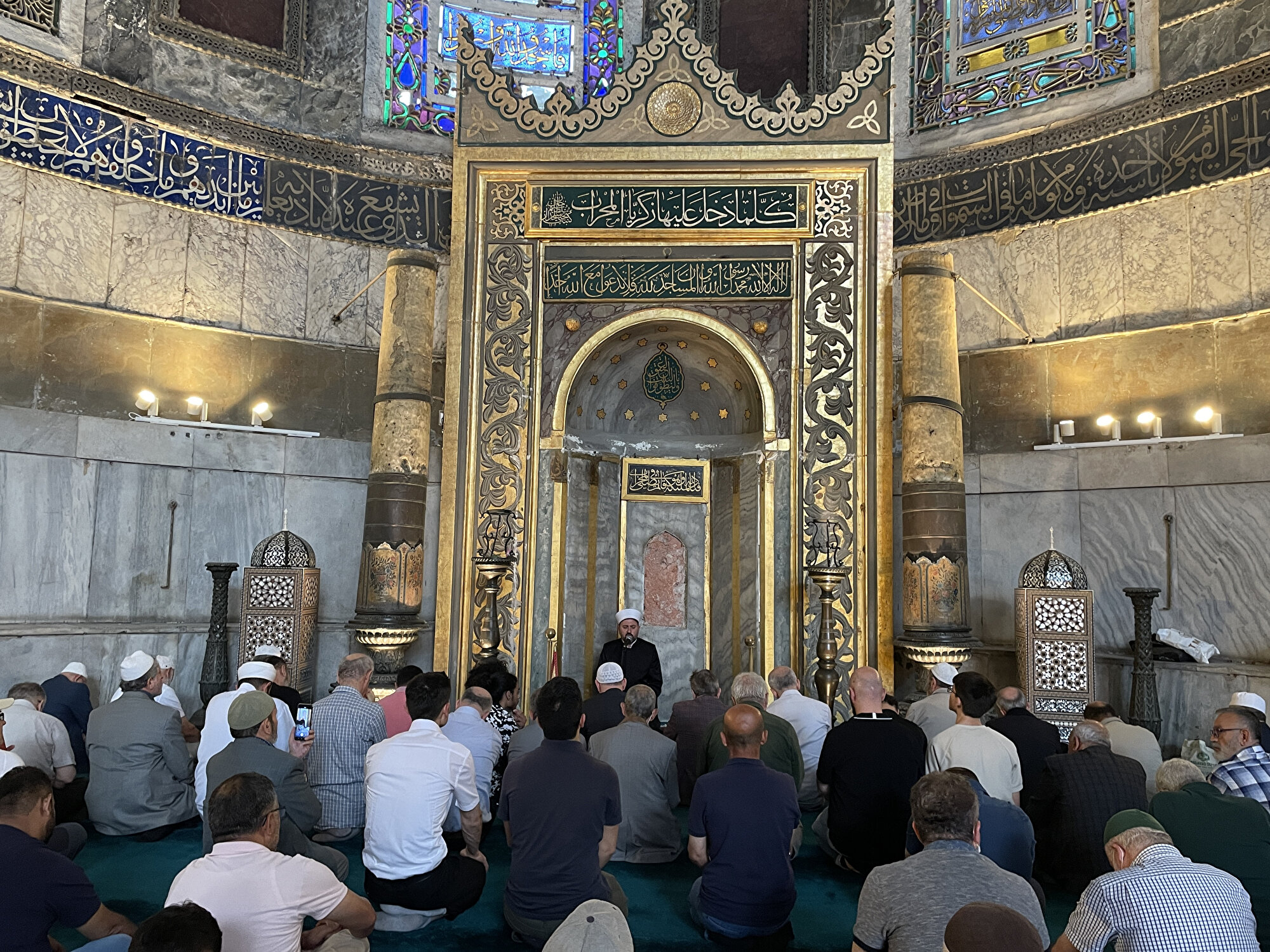 Namazdan önce Kur'an-ı Kerim okuyan Ayasofya-i Kebir Camii Şerif imam hatibi hafız Bünyamin Topçuoğlu, ardından