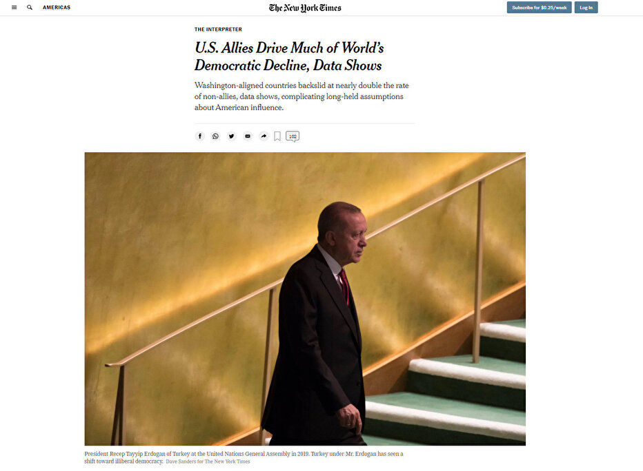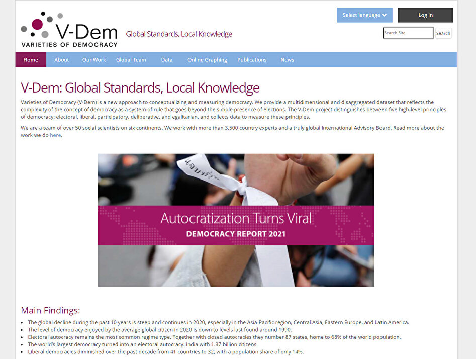 İsveç merkezli düşünce kuruluşu V-Dem, ‘2021 Demokrasi Raporu’nu yayınladı. "ABD'nin müttefiklerinde demokrasinin, ABD'yle müttefik olmayan ülkelere göre daha fazla gerilediği"ne yönelik rapor, Amerikan New York Times gazetesinde analiz haber olarak kendine yer buldu.