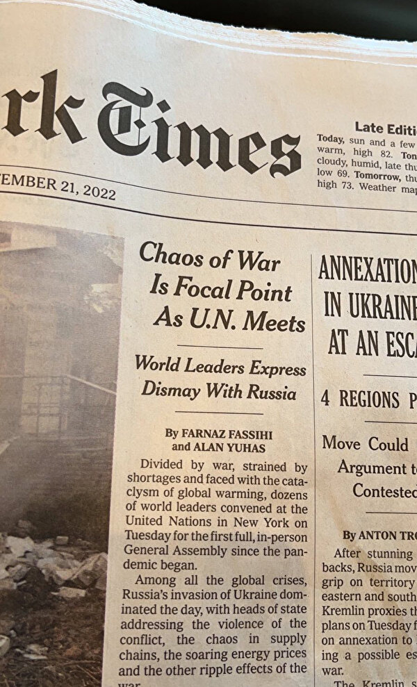 ABD'nin en önemli yayın kuruluşlarından New York Times'ın manşetten verdiği bir makalede, Cumhurbaşkanı Recep Tayyip Erdoğan'ın Rusya-Ukrayna krizinde dünya barışı için diplomatik çabalarına övgüde bulunuldu. Makalede, Fransa Cumhurbaşkanı Emmanuel Macron'un arabulucu olma çabalarının ise karşılıksız kaldığı belirtildi.