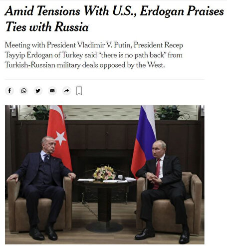 Cumhurbaşkanı Recep Tayyip Erdoğan, Rusya'ya günübirlik bir ziyarette bulunarak Rusya Devlet Başkanı Vladimir Putin ile görüştü. New York Times gazetesi, bu görüşme ile ilgili bir analiz haber yayımladı. Haberde "Erdoğan Putin'e yakınlaşarak ABD'yi tehdit ediyor" ifadelerine yer verildi.