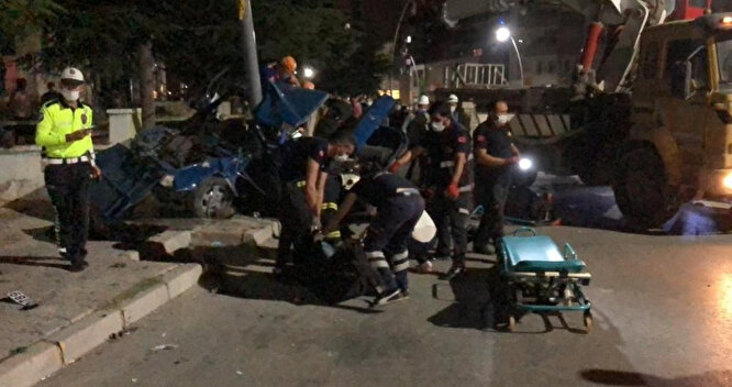 Yol kenarındaki aydınlatma direğine çarparak ikiye bölünen otomobili gören vatandaşların ihbarı üzerine kaza yerine ambulans ve itfaiye sevk edildi.