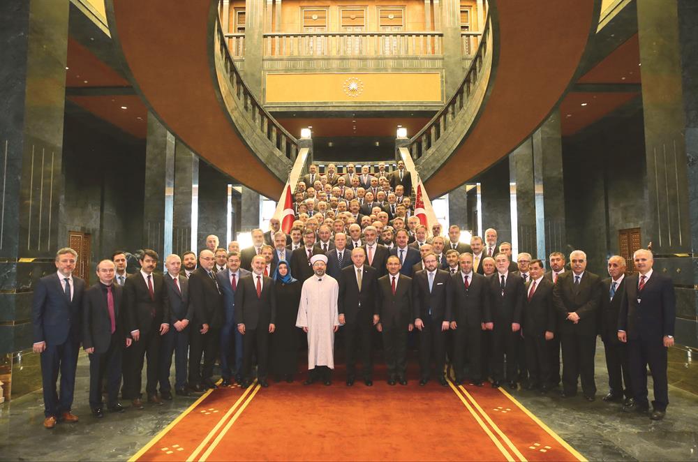 Cumhurbaşkanı Tayyip Erdoğan, dün 81 il müftüsünü kabul etti. Müftülerin sorunlarını dinleyen Erdoğan, din adına yapılan yanlış açıklamalara dikkati çekti. Erdoğan, Türkiye Diyanet Vakfının “Uluslararası İyilik Ödülleri” programına katılmak üzere Ankara’ya gelen 81 ilin müftüsünü, Cumhurbaşkanlığı Külliyesi’nde kabul etti. Başbakan Yardımcısı ve Hükümet Sözcüsü Bekir Bozdağ ile Diyanet İşleri Başkanı Ali Erbaş’ın da yer aldığı kabul 50 dakika sürdü. Toplantıda Erdoğan’ın son günlerde din adına yaptığı yanlış açıklamalarla kafaları karıştıranlara yönelik değerlendirmelerde bulunduğu öğrenildi. Erdoğan’ın, Diyanet İşleri Başkanlığı, ilahiyatçılar ve ilahiyat fakültelerinin bu konuda biraraya gelip istişare ile gereken cevabı vermeleri yönünde görüşlerini tekrarladığı belirtildi. Edinilen bilgilere göre, Cumhurbaşkanı Erdoğan, kabul ettiği müftüleri dinleyerek sorularını aldı. Bir de konuşma yapan Erdoğan, “Her sorumluluk vebal getirir. Ama sizin sorumluluğunuz doğrudan hayat kaynağımız olan dinimizle ilgili olduğu için vebaliniz çok büyük, ona göre. İşi hiç hafife almayalım. Cumhurbaşkanı olarak daima yanınızda olduğumu bilmenizi isterim” diyerek meydanı boş bırakmamalarını istedi.