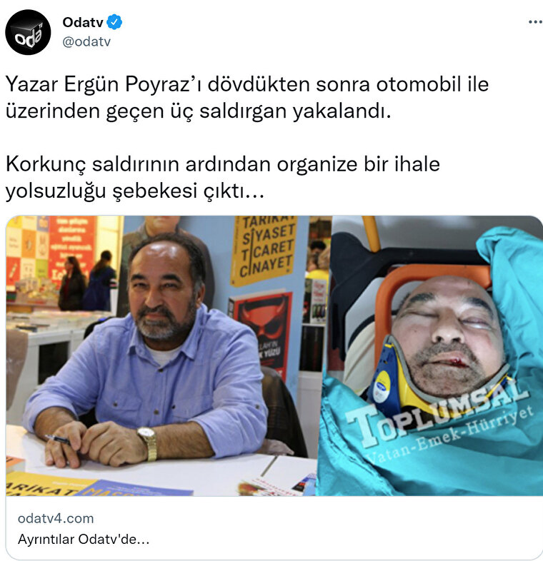 Ergün Poyraz'a düzenlenen saldırının yankıları devam ederken saldırganların yakalandığını duyuran Oda TV'nin haberi tepki çekti. Haberi, Ergün Poyraz'ı tehdit ettiği öne sürülen CHP'li başkan Ömer Günel'in adını geçirmeden servis eden Oda TV, saldırının arkasında organize bir ihale yolsuzluğu şebekesi olduğunu öne sürdü.