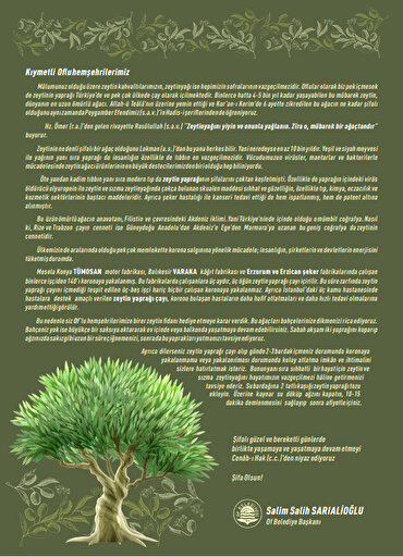 - "Ayrıca dilerseniz zeytin yaprağı çayı alıp günde 2-3 bardak içmeniz durumunda koronaya yakalanmama veya yakalanılması durumundakolay atlatma imkân ve ihtimalinisizlere hatırlatmak isteriz. Bunun yanı sıra sıhhatli bir hayat için zeytin ve sızma zeytinyağını hayatımızın vazgeçilmez hâline getirmenizi tavsiye ederiz. Su bardağına2 tatlı kaşığızeytin yaprağı tozu ekleyin. Üzerine kaynar su döküp ağzını kapatın,10-15 dakikademlenmesin sağlayıp sonra afiyetle içiniz."