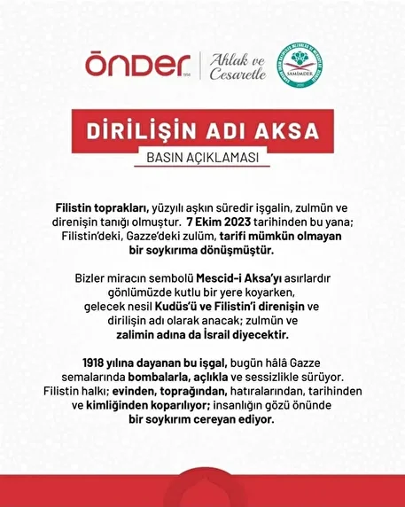 Bizler dün olduğu gibi bugün de ümmet bilinciyle Filistinli kardeşlerimizin yanında olup insani ve vicdani sorumluluklarımızı yerine getirmek adına, dünya halklarına yön vererek ses olmaya devam ediyoruz.