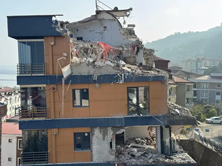 Ordu'da zemindeki kayma nedeniyle çatlaklar oluşunca tahliye edilen 2 binadan birinin yıkımı yapılıyor.
