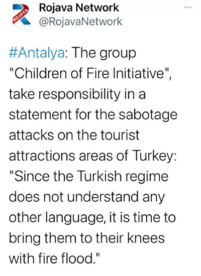Peş peşe başlayan yangınlar sonrası sabotaj iddiası ciddi şekilde araştırılıylor. Türkiye'yi hüzne boğan orman yangınlarının sabotaj olduğu tartışılırken yangınları, PKK'ya bağlı "Ateşin Çocukları İnisiyatifi" üstlendi.