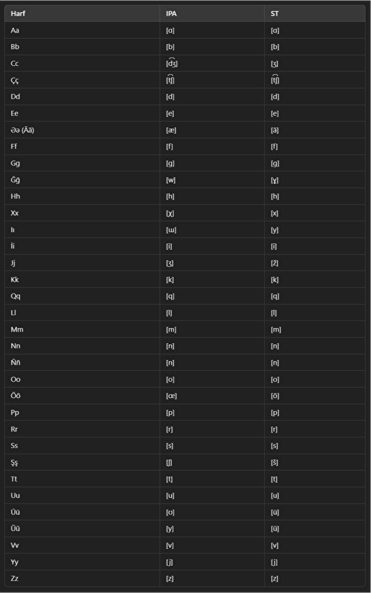 Sovetskaya Tyurkologiya Yayın Kurulu tarafından kabul edilen Latin harflerine dayalı Uluslararası Fonetik Transkripsiyon (1974)