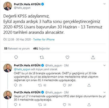 ÖSYM Başkanı Aygün, sosyal paylaşım sitesi Twitter'daki hesabından yaptığı açıklamada, eylül ayında ardışık 3 hafta sonu gerçekleştirecek 2020-KPSS lisans başvurularının 30 Haziran- 13 Temmuz'da alınacağını bildirdi.